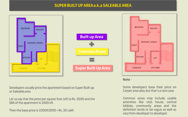 開發(fā)商通過將總建成區(qū)面積與公共區(qū)域(包括走廊、電梯大堂、電梯等)所占面積相加,得出單元的超建面積。在某些情況下,建筑商甚至在公共區(qū)域包括游泳池、花園和俱樂部會所等設(shè)施。